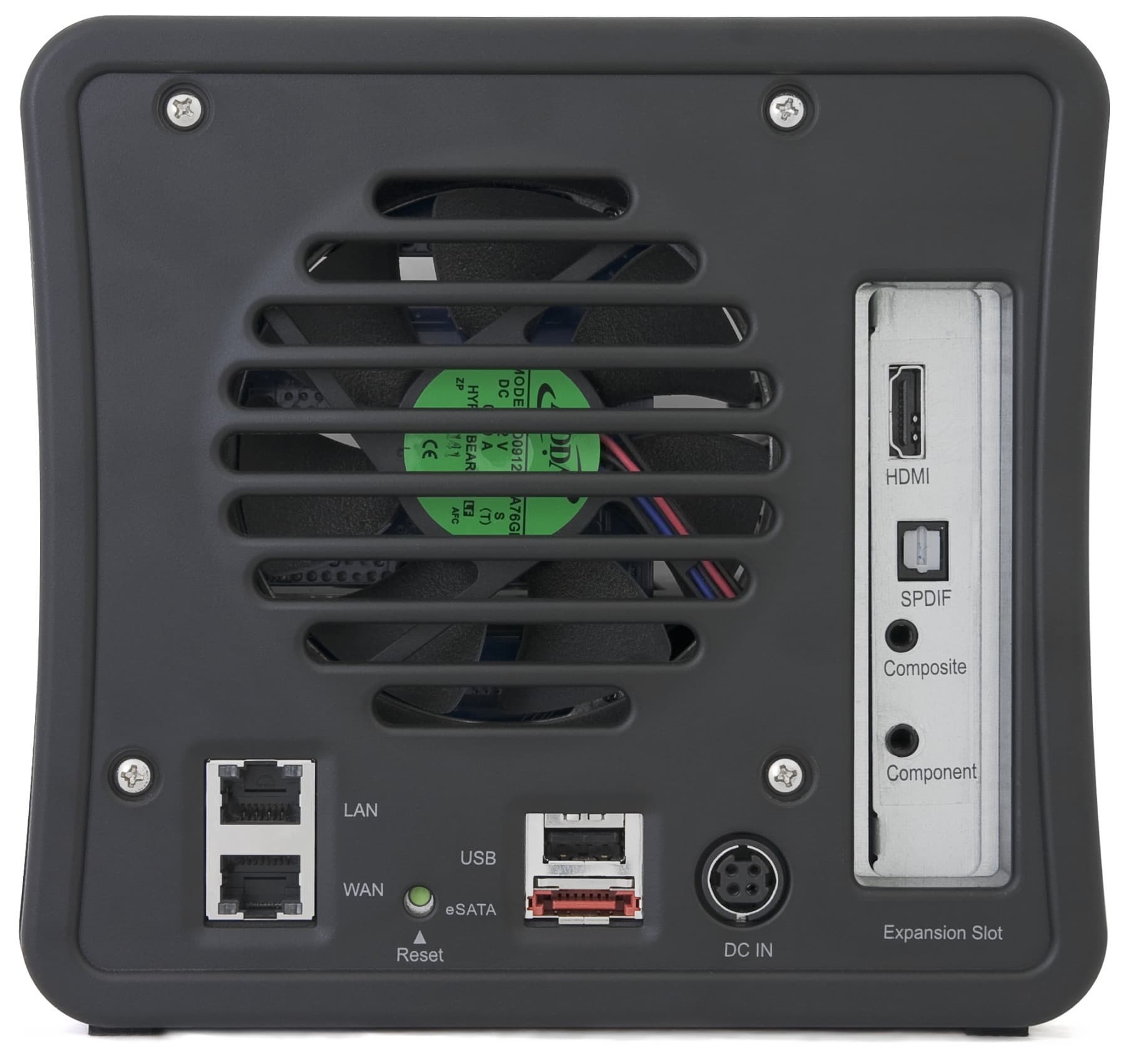 Сзади находится решетка 92 мм вентилятора системы охлаждения, два сетевых порта, USB и eSATA для внешних устройств, вход для блока питания (с удобно защелкой, повышающей надежность соединения), кнопка сброса и слот с аудио-видео выходами (HDMI, цифровой оптический для звука, компонентный видео, композитный видео + стерео аудио).