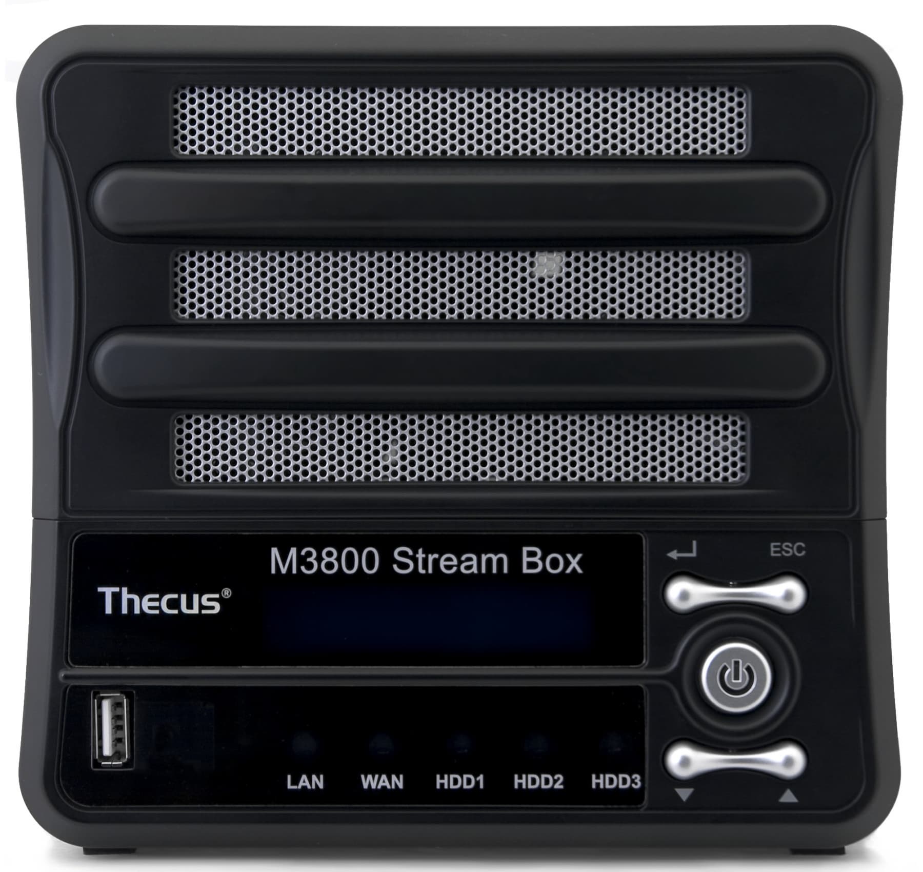 Возможности стандартны для устройств марки Thecus — сетевой накопитель на три винчестера с поддержкой массивов JBOD, RAID0/1/5, папок с устанавливаемыми для пользователей правами, сетевых протоколов SMB/FTP/NFS, медиасерверов DLNA и iTunes, автономной загрузкой файлов по HTTP/FTP/BitTorrent. Расширение возможностей допускается через устанавливаемые пользователем модули. Модель M3800 от остальных сетевых накопителей отличает встроенный функционал медиаплеера — при подключении к телевизору или другому устройству отображения можно просматривать фотографии и видеролики, а также слушать музыку.