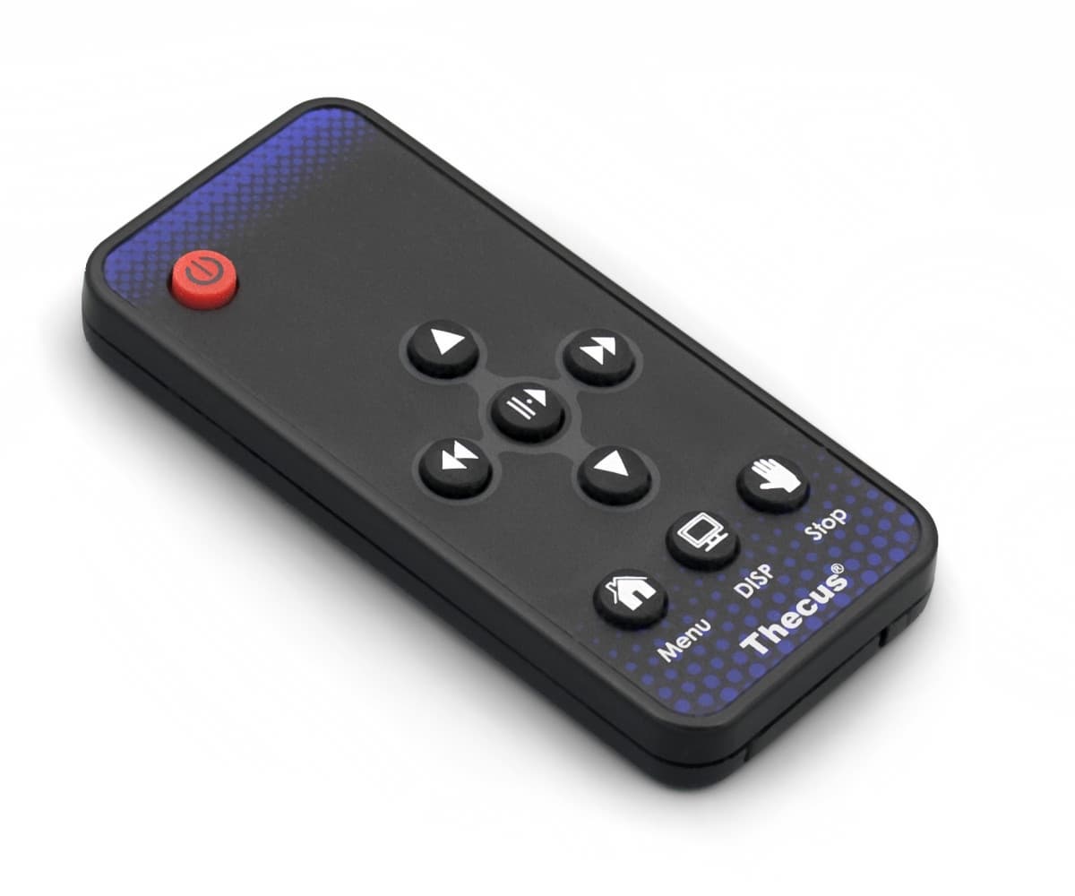 Для управления используется миниатюрный пульт дистанционного управления, на котором находится всего девять кнопок. Дальность работы пульта — более пяти метров. На каждую принятую команду устройство реагирует миганием индикатора OSD. Возможности подключения выносного ИК-датчика не предусмотрено, так что накопитель нужно будет располагать около устройства отображения.