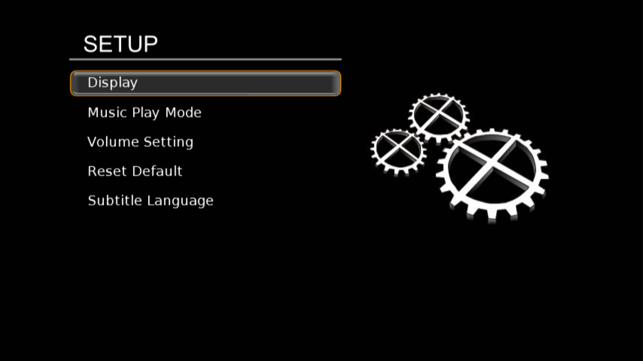 Основное меню плеера состоит из привычных четырех пунктов — видео, фото, музыка, установки. Отметим, что все это на английском языке, но самих текстов в принципе настолько мало, что особых проблем это не вызывает. Настройки собраны в пяти пунктах — выбор режима экрана (тип подключения, формат, стандарт, разрешение), режим проигрывания музыки (случайный порядок, повтор альбома, повтор песни), громкость аудиовыходов, сброс настроек, выбор языка субтитров (есть CP1251 и Unicode).