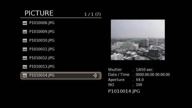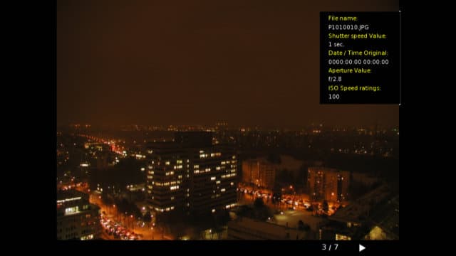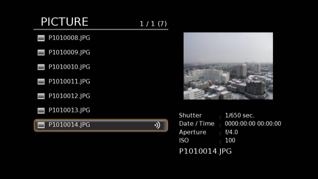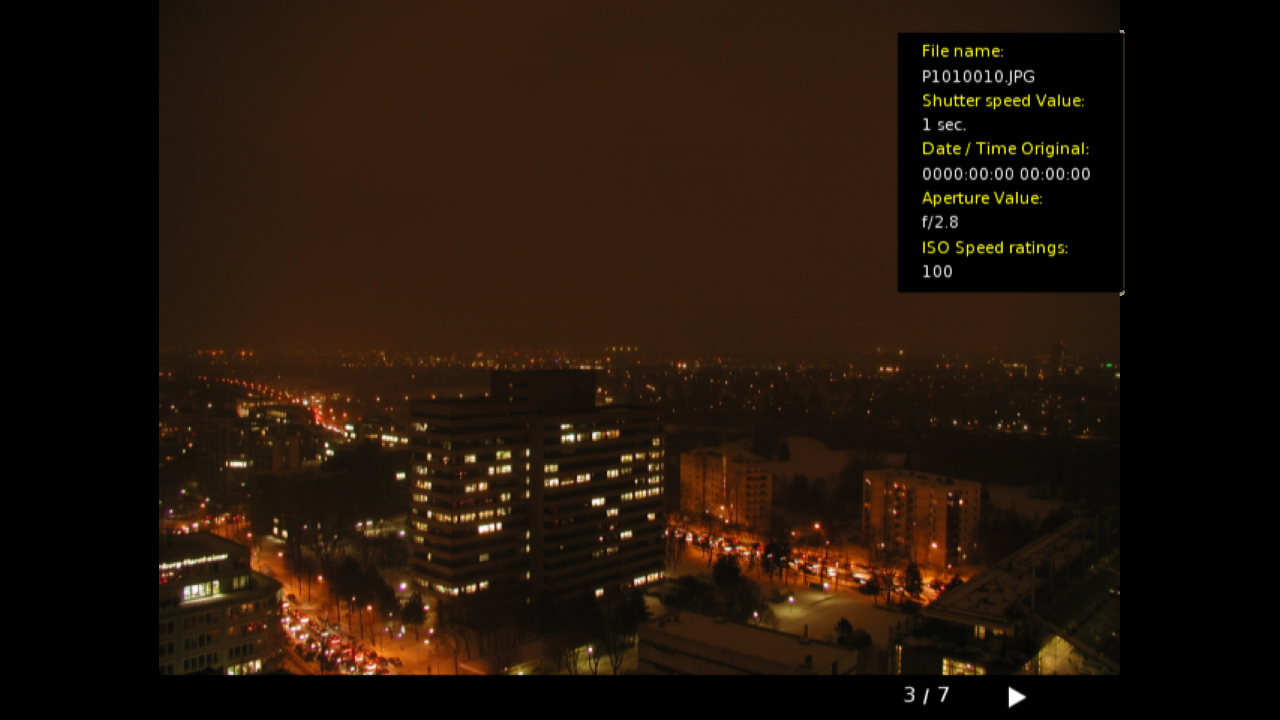 Ну делать нечего, записываем тестовые файлы из DivXTestCD 2.0 в папки Picture, Music, Movie накопителя и приступаем к тестам. Начнем с простого — фотографий. Плеер может работать с файлами форматов JPEG, GIF, BMP, TIF, PNG. Для JPEG отображаются некоторые параметры из EXIF. Слайдшоу простейшее — по три секунды на фотографию. Никаких настроек нет. В общем несколько грустно. Радует только большое число форматов, хотя конечно для 99% пользователей более чем достаточно обычного JPEG.