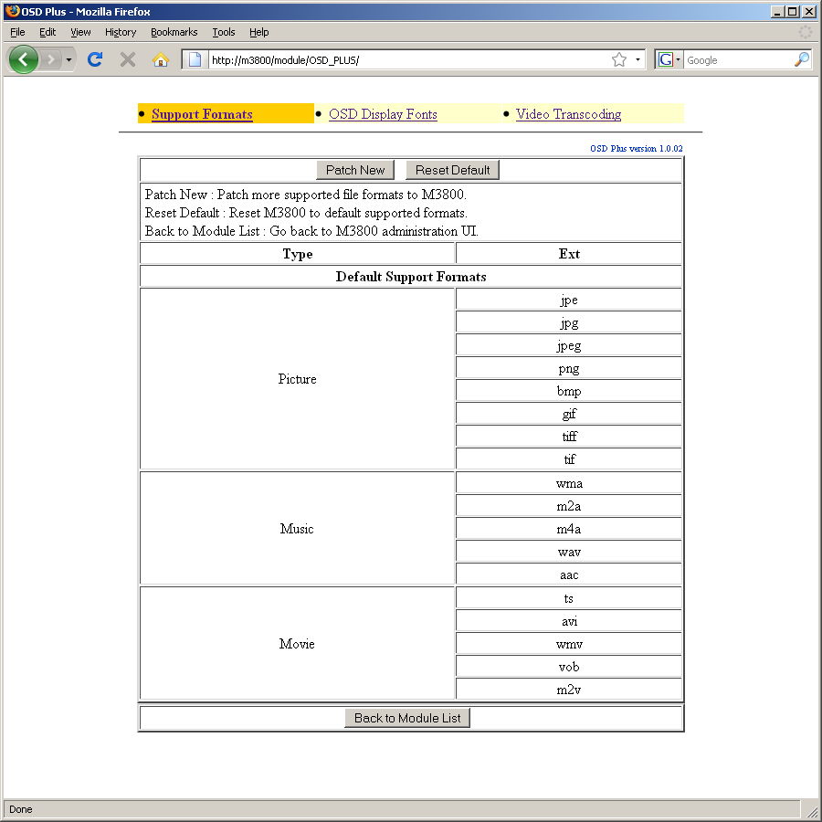 К счастью, описанное плачевное состояние с совместимыми контейнерами можно немного исправить благодаря автору плагина для прошивки под названием OSD_PLUS. После его установки на устройство, включения и активизации появляется возможность работы с MP3 (наконец то…), MPG и MPEG. С его помощью можно также изменить используемый OSD шрифт и транскодировать с использованием встроенного mencoder некоторые типы файлов (MKV, FLV, RM). Ну а если уж совсем «гулять, так гулять!», то SSH вам в руки и может быть и m2ts покорится...