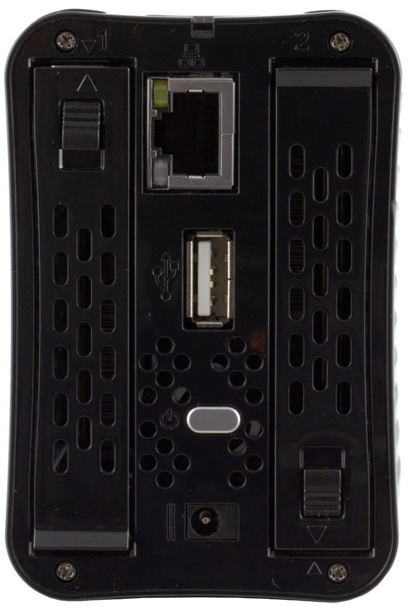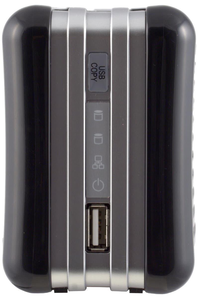 Собственно корпус выполнен полностью из пластика — черные боковые стенки и серебристая рамка между ними. Устройство практически полностью покрыто вентиляционными решетками — активного охлаждения не предусмотрено, так что это вполне логично. На передней панели привычные индикаторы (активность дисков, активность сети, состояние устройства), порт USB и кнопка с подсветкой для копирования данных с подключенного накопителя. Сзади — слоты для установки дисков, вход питания, сетевой порт, второй порт USB, кнопка включения. Интересно, что несмотря на компактный размер, устройство имеет отсеки для дисков с возможностью горячей замены.