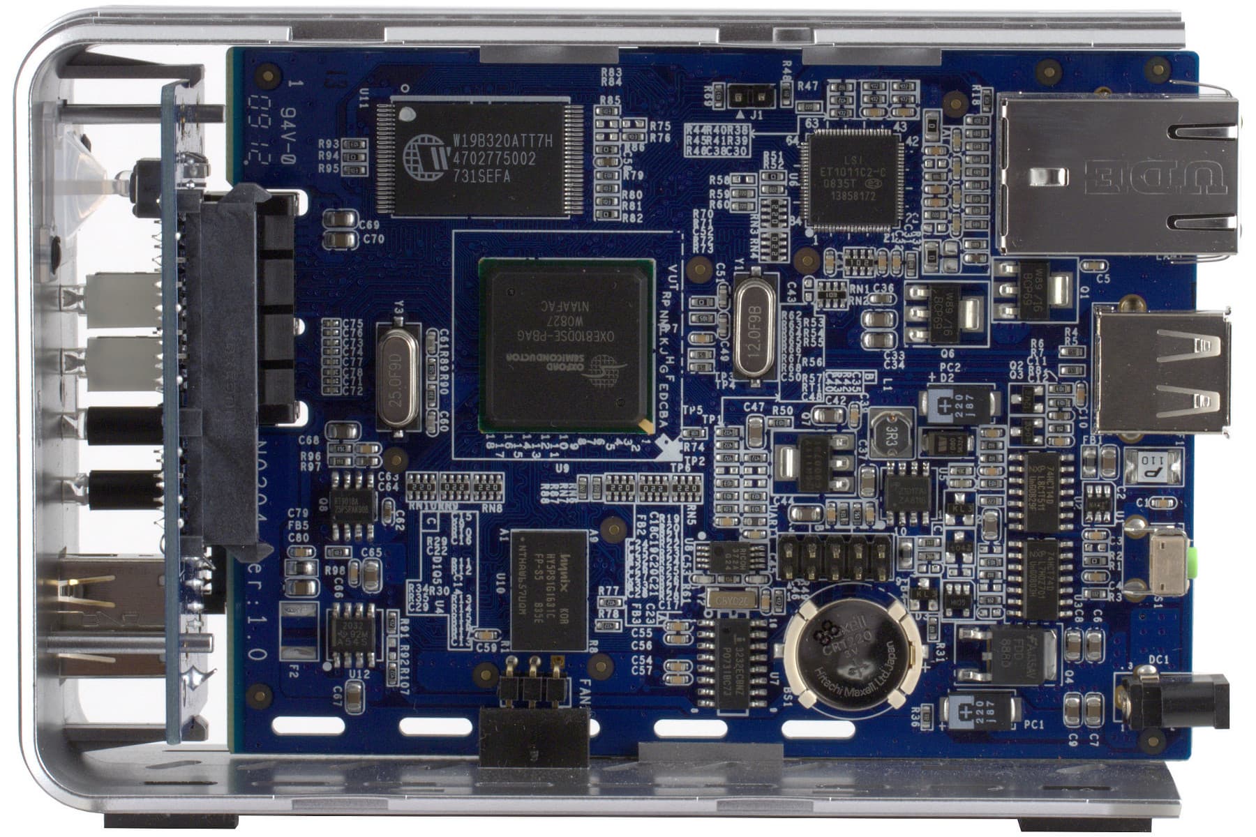Вся начинка собрана на одной печатной плате, которая располагается в центре устройства между винчестерами. Основой системы является чип OXE810DSE-PBAG от компании Oxford Semiconductor входящей в состав PLX Technology. Эта микросхема объединяет в себе вычислительное ядро ARM и контроллеры SATA, Gigabit Ethernet и USB. Данный чип можно встретить и в других недорогих моделях сетевых накопителей.