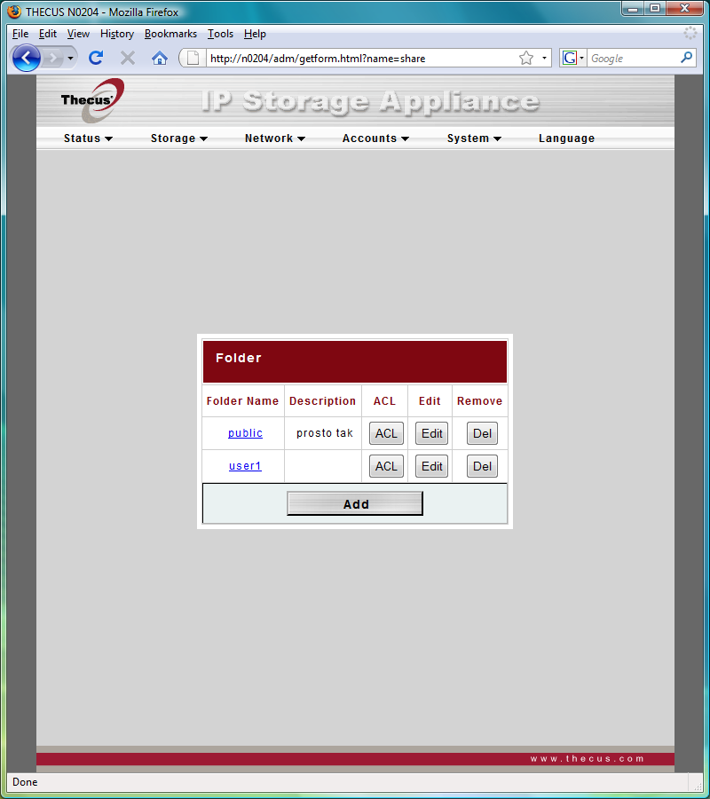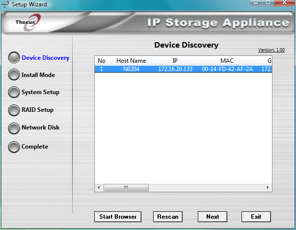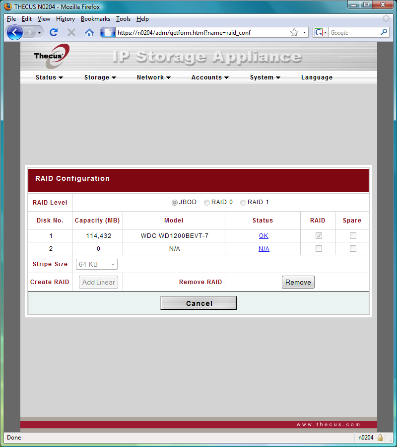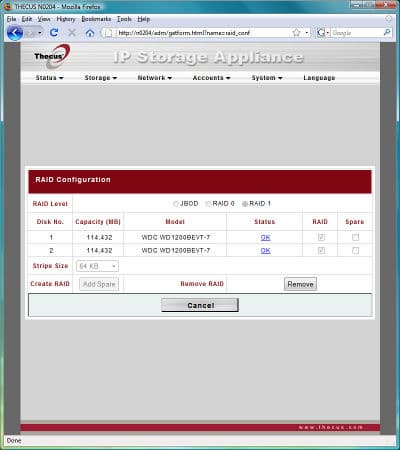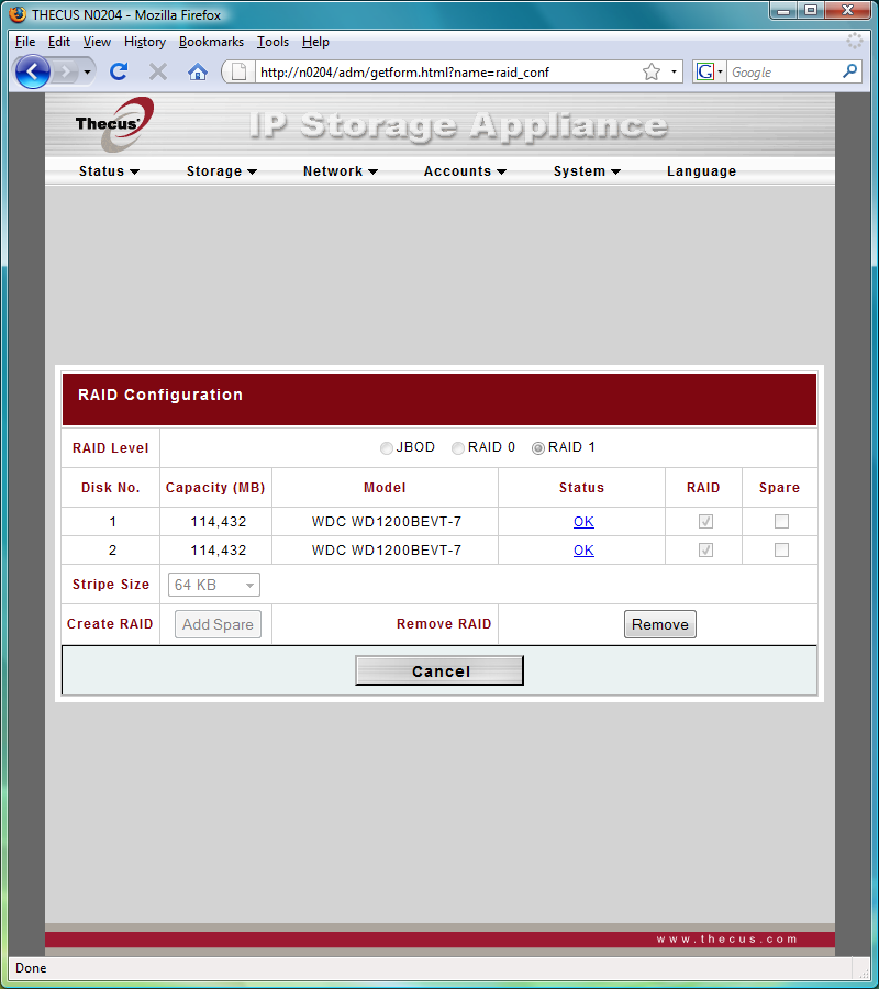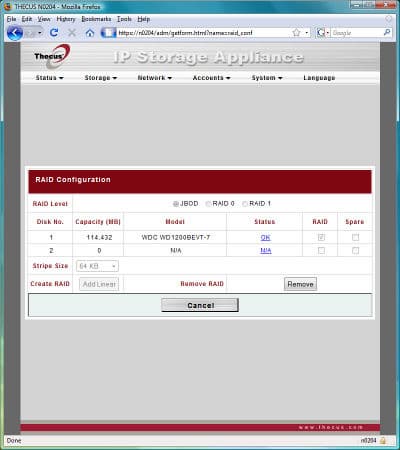 Дальше все обычно — подключаем питания и сеть, включаем устройство и запускаем программу Thecus Setup Wizard. Отметим, что для N0204 используется ее специальная версия, а не общая для большинства других устройств компании. Причина этого — в конфигурации накопителя и организации хранения прошивки. Дело в том, что у N0204 часть прошивки находится на самих винчестерах. Кроме того, их конфигурацию (в случае если установлено два диска) можно поменять только из этой программы. Web-интерфейс настроек такой возможности не имеет. Хотя первый этап «перенастройки» — удаление массива — осуществляется именно через него. Это достаточно существенный момент и необходимо обратить на него внимание при начальном конфигурации устройства. Особенно пользователеи операционных систем семейства Linux — программа настройки работает только под Windows и Mac OS.