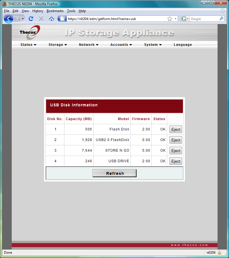 USB-портов у N0204 всего два. Однако при подключении накопителей можно использовать USB-хаб, что практически полностью исключает возможные ограничения. Но тут возникает другая проблема — работа только с файловыми системами FAT32 и EXT2/3. NTFS нельзя даже прочитать. Форматирование средствами накопителя не предусмотрено. Собственно диски монтируются под своими номерами в общую директорию USBHDD, права доступа к которой пользователь может поменять. Для жестких дисков можно использовать даже вариант с несколькими разделами — все совместимые с указанными файловыми системами будут подключены. После завершения работы с USB-накопителями можно их безопасно отключить через Web-интерфейс. Скорость работы с флешками по сети средняя — около 6 МБ/с на запись и 12 МБ/с на чтение (проверялось с файловой системой FAT32).