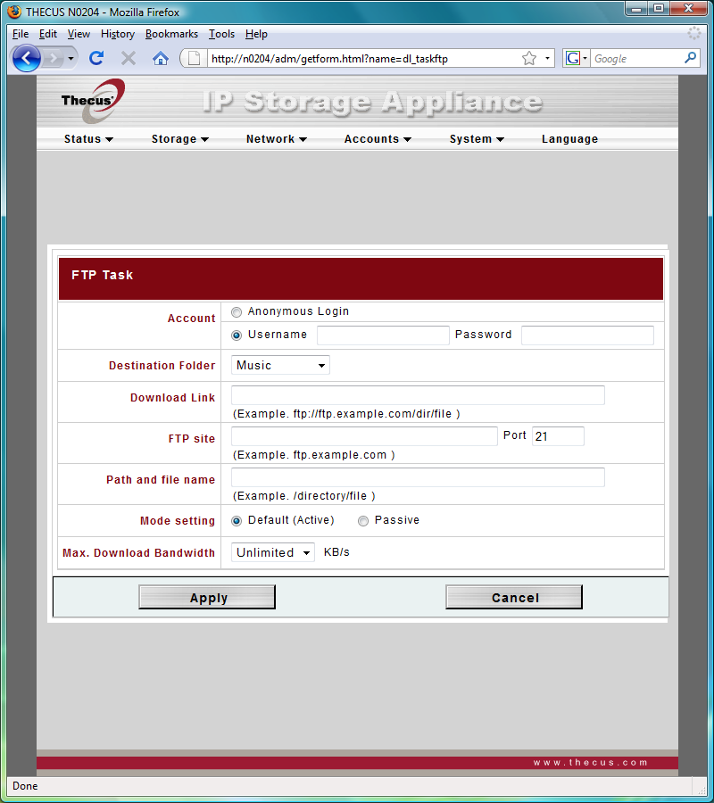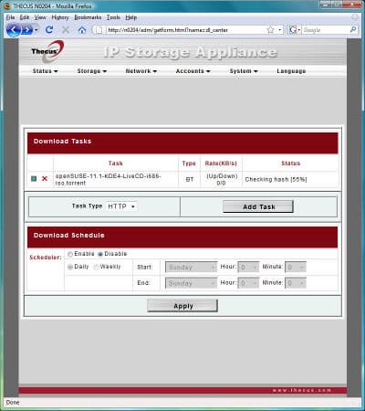 Станция загрузки файлов справляется с протоколами HTTP, FTP и BitTorrent. Для ее работы используются утилиты wget и rtorrent. Первый вполне удобен и управляем — можно задавать ограничения на скорость скачивания, имя и пароль пользователя (для FTP). А вот работа с торрентами выглядит грустно — мало того, что нельзя выбрать порты работы, так они еще и неизвестны (их можно найти в документации на программу). Кроме того, нет возможности раздачи после загрузки, а максимальное число всех активных задач составляет пять. Хотя последний момент конечно характерен для подобных низкопроизводительных платформ. Так что единственными плюсами можно назвать выбор директории для загрузки для каждого задания индивидуально и работу по расписанию.