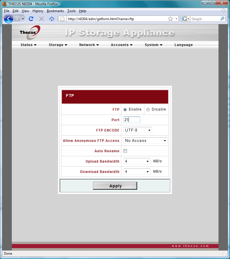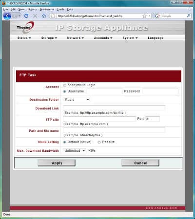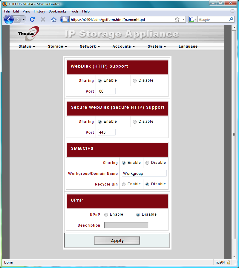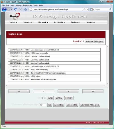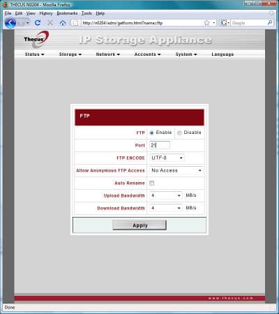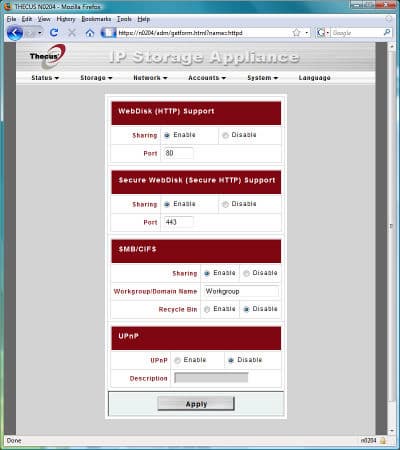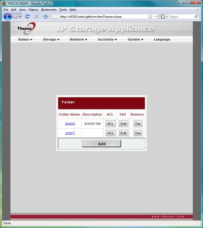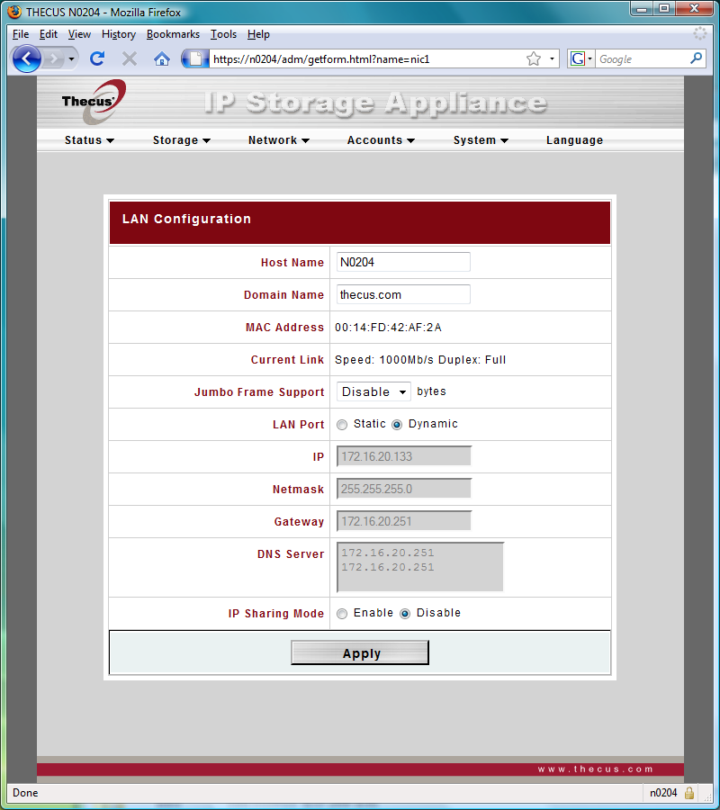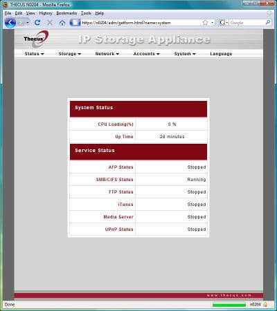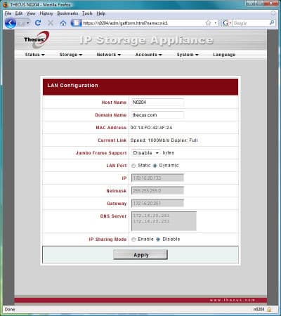 Традиционное меню от компании Thecus оформлено в стандартном виде — в верхней части окна список с раскрывающимися пунктами, а центральную часть окна занимает непосредственно информация страницы и поля ввода.