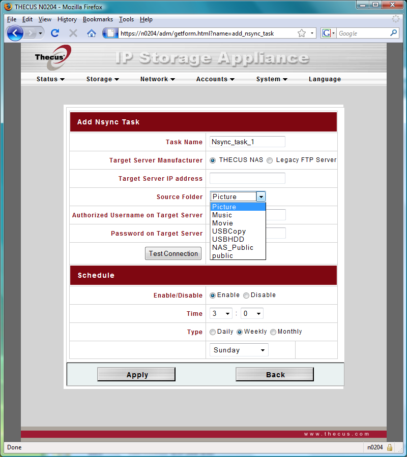 Второй возможностью повышения надежности хранения данных методом бекапа на другое устройство является сетевое копирование. Для него можно использовать как устройства от Thecus, так и любой FTP-сервер. Первый вариант может быть более безопасен, поскольку работает через шифрованный VPN-канал между накопителями. С другой стороны, FTP более универсален, так как не требует именно устройства от Thecus в качестве сервера. Система работает по расписанию, поддерживает несколько заданий и копирует общие папки только целиком. Возможность работы сервером для Nsync (так это все называется) включается в последнем пункте третьей группы страниц Web-интерфейса.