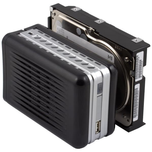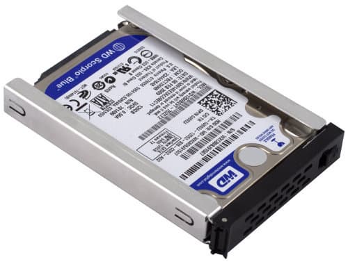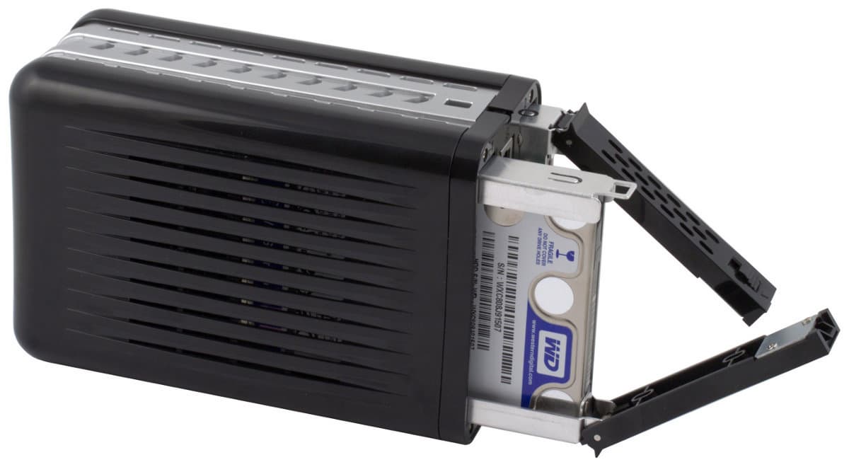 Устройство поставляется без жестких дисков, так что для запуска пользователю потребуется приобрести один или два 2,5″ SATA винчестера. Они крепятся на алюминиевые рамки, которые устанавливаются в корпус накопителя. В официальном списке совместимости представлены модели серий Seagate Momentus и WD Scorpio Blue объемом от 80 до 500 ГБ. Скорее всего будут работать и любые другие диски, однако мы рекомендуем выбирать именно из этого списка. На производительность выбор влияет мало, так что в этой ситуации гарантированная совместимость важнее.