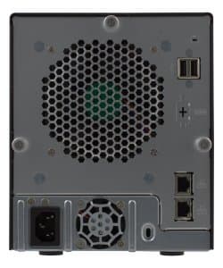 Задняя панель содержит два сетевых порта с индикаторами подключения и активности, два порта USB, вход питания, большой 90 мм вентилятор для дисков, и 40 мм — для встроенного блока питания. Данная система охлаждения вполне успешно справляется со своей задачей, при этом уровень шума находится на допустимом уровне (не стоит забывать, что и четыре жестких диска тоже не очень молчаливы).