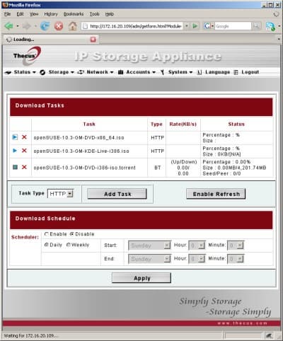 Download Manager позволяет скачивать на накопитель без участия ПК файлы по протоколам HTTP/FTP/BT. Задания может добавлять только администратор и только через Web-интерфейс. Для HTTP/FTP задается URL, директория, в которую нужно скачать файл и максимальная скорость. Для этих протоколов используется известная утилита wget. Загрузка начитается, только когда вы нажимаете на синий треугольник напротив нового задания. После того, как загрузка началась, поменять параметры уже нельзя. Файлы, которые не были загружены полностью, доступны в директории назначения. У заданий Bittorrent указываются максимальные скорости загрузки/отдачи и максимальное количество партнеров. В окне контроля за работой программы отображены все текущие задачи с указанием процента выполнения, скорости и других данных. Производитель предупреждает о возможном ограничении в 4 ГБ на максимальный объем файлов для протокола BT в текущей прошивке, однако скачанный для проверки дистрибутив Linux объемом 4,1 ГБ имел верную контрольную сумму. К сожалению, порты, используемые BT, нигде не указаны, и пришлось использовать специальные программы для их обнаружения. Судя по всему, раздача файлов останавливается после их загрузки. Клиент основан на пакете libtorrent. Для работы сервиса можно задать определенные часы или дни работы.