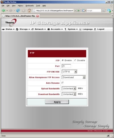 Для облегчения доступа к устройству из Интернет, можно использовать встроенного DDNS-клиента (поддерживаются несколько сервисов). На закладке «Service» можно запретить доступ к файлам по HTTP/HTTPS (в частности, можно оставить только защищенный вариант), изменить номера портов для этих функций, запретить работу сети Windows (SMB/CIFS). Устройство поддерживает сетевой доступ с компьютеров Apple, по-умолчанию эта функция выключена. Для FTP-сервера можно указать порт, выбрать кодировку (включая UTF-8, что решает все проблемы с русскими именами файлов), установить права для анонимного подключения, а также максимальные скорости загрузки и отдачи.