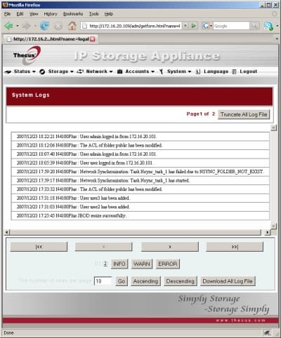 Накопитель ведет свой внутренний лог-файл. При необходимости, его можно посмотреть через Web-интерфейс или скачать на локальный компьютер. К сожалению, он не очень информативен, производителю стоит подумать об увеличении списка протоколируемых событий.