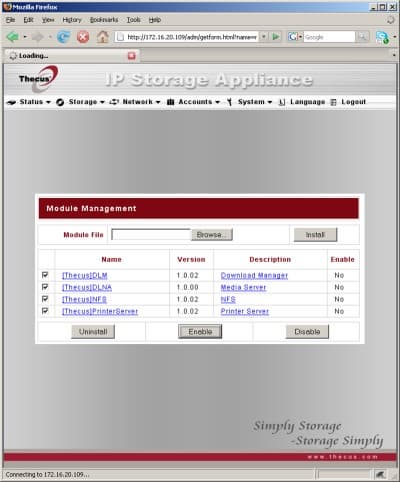 Упомянутые выше модули используются для расширения возможностей устройства с сохранением базовой прошивки. Управление модулями включает в себя непосредственно установку, разрешение/запрет работы, внутреннюю настройку самих модулей. В настоящий момент производитель предлагает следующие функции: Download Manager, Media Server, NFS, Print Server.