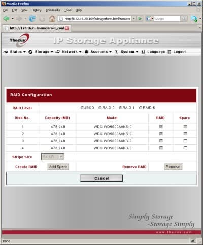 Настройка RAID позволяет создать только один массив, что несколько ограничивает возможности устройства. Доступны конфигурации RAID 0, 1 и 5 и JBOD. Есть возможность указать запасные диски для замены при возникновении проблем с отказоустойчивыми массивами. Для большинства вариантов можно указать размер блока (от 4 КБ до 4096 КБ). Работа с массивами при использовании дисков большой емкости происходит достаточно медленно. Например, на создание RAID 5 из трех 500 ГБ дисков требуется более десяти часов. При выходе из строя элемента отказоустойчивого массива, система при наличии возможности, пытается его восстановить. Администратор может узнать об этой ситуации по логам, сообщению на e-mail или состоянию индикаторов на передней панели. Возможна и звуковая сигнализация, но ее можно выключить только по сети, что не всегда удобно. Массив типа JBOD можно расширить без потери информации, добавив один или несколько дисков.