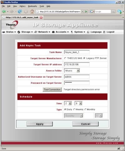 В этом же разделе настраиваются задания для синхронизации данных на сервере с другим устройством. При этом партнером может быть как аналогичный накопитель или FTP-сервер. Для каждого задания можно указать расписание работы и время запуска. Режим работы в качестве «приемника» (Nsync Target) включается в другом меню.
