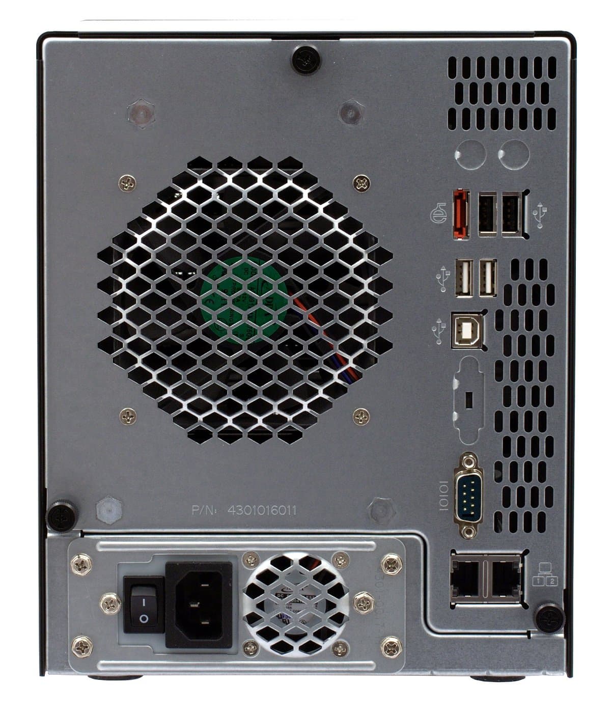 Сзади традиционно собрано большинство разъемов. У N5500 здесь можно найти четыре порта USB 2.0 (хост), один порт eSATA, один порт USB-таргет, два гигабитных сетевых порта и последовательный порт. Но больше всего места занимает основной вентилятор системы охлаждения. Не очень понятно, почему для него выбрали формат 90 мм, поскольку и 120-мм вентилятор точно здесь бы уместился. Снизу также можно обнаружить элементы блока питания — вход кабеля, выключатель и небольшой вентилятор (40x20 мм).