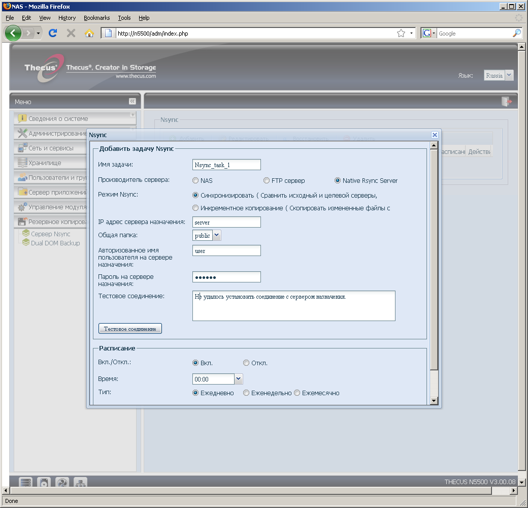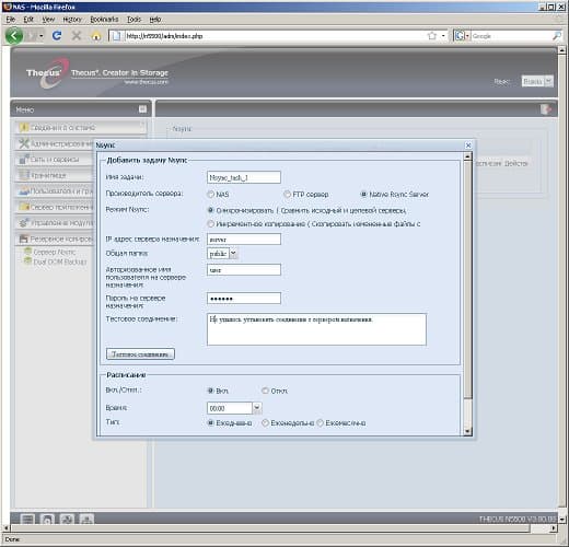А сейчас рассмотрим последнюю группу — «Резервное копирование». Страницы здесь только две. Первая посвящена настройке встроенных задач копирования, работающих с аналогичными устройствами (Nsync, подразумевающий VPN-соединения между системами), по протоколу rsync или через FTP. Собственно включение поддержки накопителя сервисов Nsync/rsync также присутствует в настройках. Можно попробовать использовать данный сервис и с другими сетевыми накопителями, однако, к сожалению, стараться сделать их совместимыми никто не спешит. Хотя нам и удалось использовать rsync-сервер в N5500 для бекапа данных с NAS другого производителя, в общем случае это не просто. Поскольку некоторые параметры для данного процесса не документированы и приходится их искать в конфигурационных файлах через консоль, что не может считаться общедоступным способом.