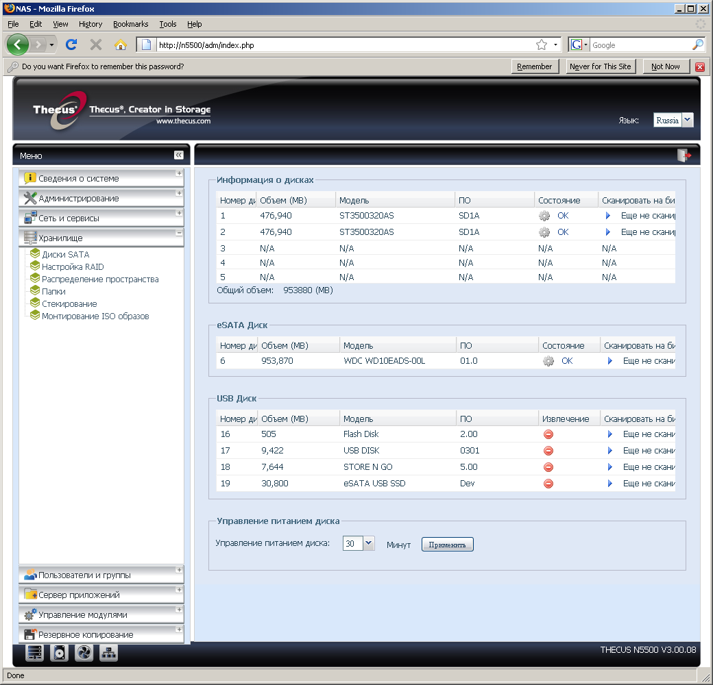 Разобравшись с сетью, займемся, пожалуй, наиболее важным элементом во всем устройстве — управлением дисками и томами. Сосредоточено оно в группе «Хранилище». На первой странице мы можем ознакомиться с подключенными к устройству дисками — узнать их модель, версию прошивки, объем. Причем это относится не только к внутренним дискам (как можно было бы подумать исходя из названия страницы «Диски SATA»), но и к внешним — USB и eSATA.