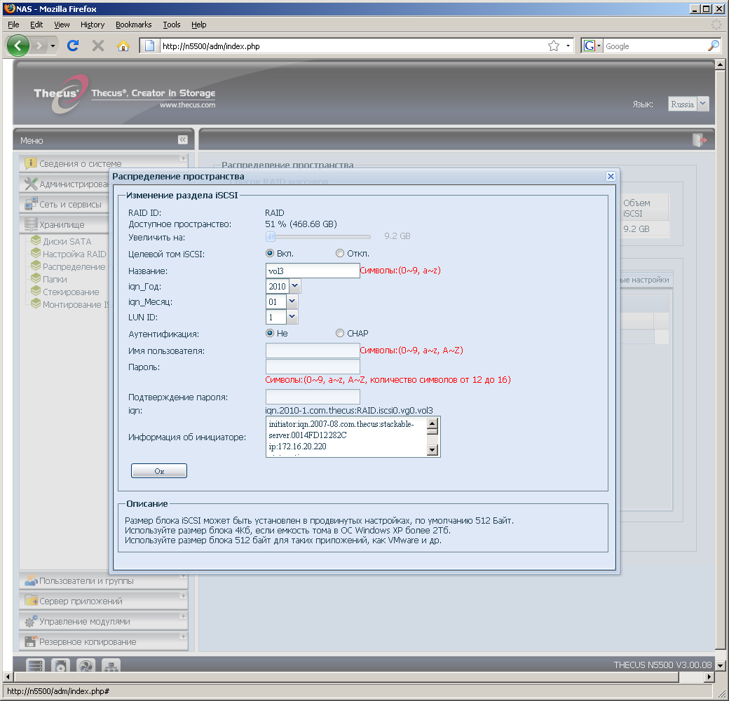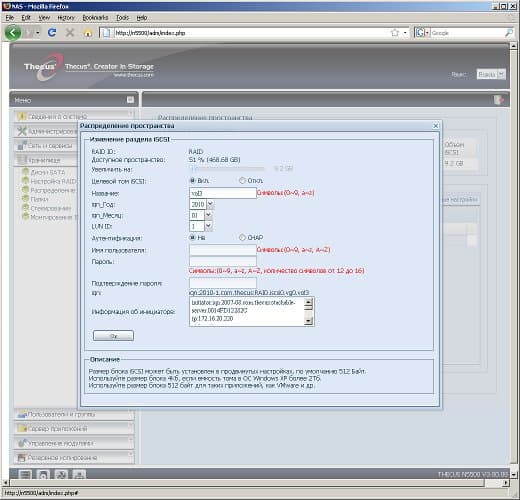 В системе есть возможность подключения удаленных томов iSCSI, то есть работы в качестве инициатора. К сожалению, проверка показала, что с другими NAS этот режим может быть и не совместим. А вот свои тома подключает без проблем. При этом для каждого тома создается сетевое имя, а доступ может ограничиваться только так же, как и для обычных папок.
