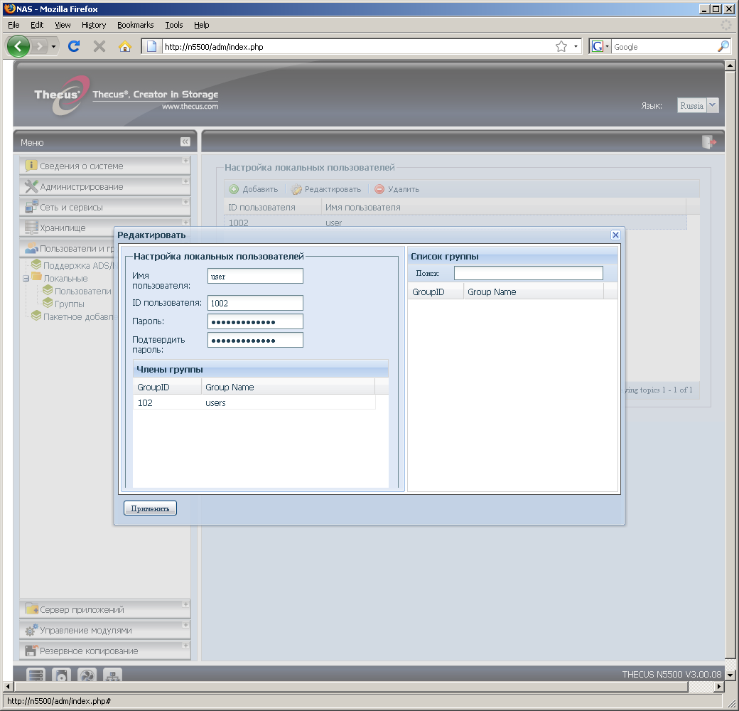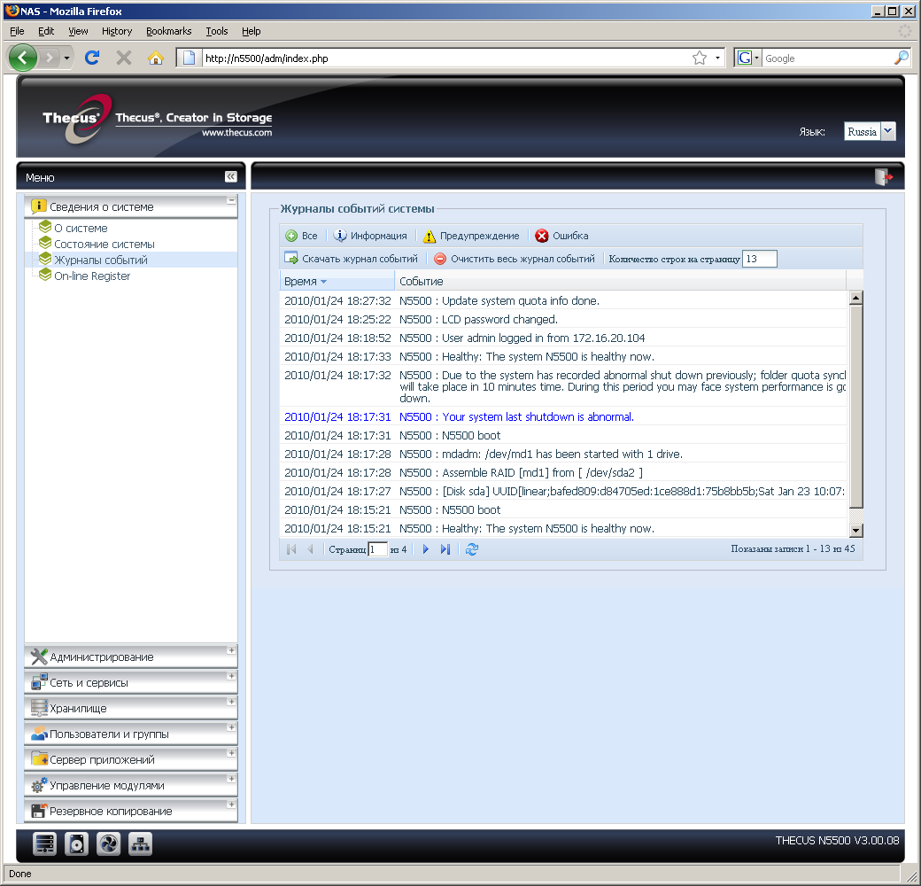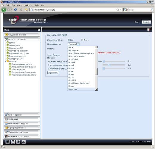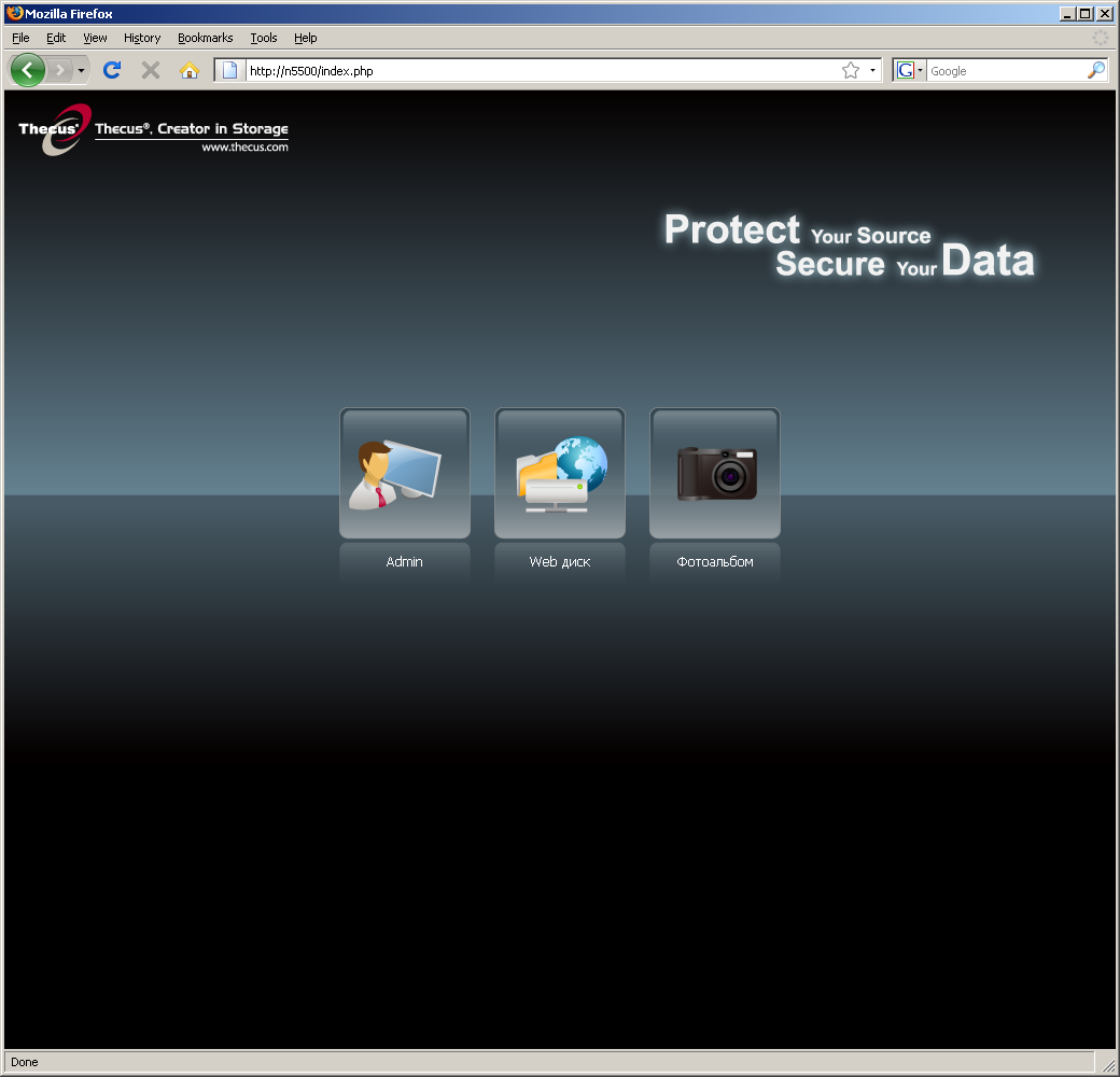 Впрочем, как мы уже говорили, использовать программу не обязательно. Достаточно просто обратиться на web-интерфейс устройства. Наконец и Thecus обновил его — внешний вид достаточно привлекателен и встречает пользователя тремя большими иконками — администрирование, web-менеджер файлов и фотосервер. На этом этапе выбрать язык пока нельзя, но после входа уже можно воспользоваться выпадающим списком, в котором есть и русский язык.