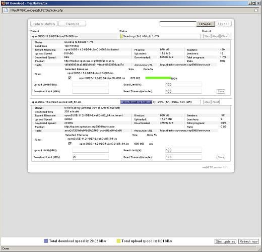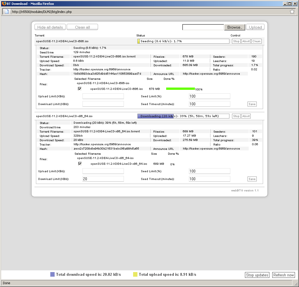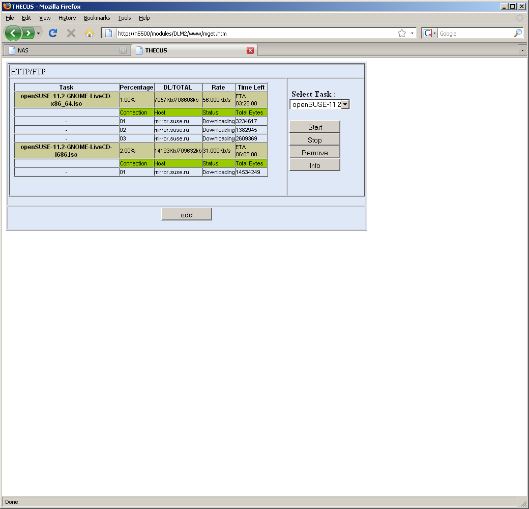 Первая из них — система автономной загрузки файлов по протоколам BitTorrent, eMule и HTTP/FTP. Клиент для первого — программа BTG. В настройках есть выбор рабочей директории, портов, ограничение скоростей и числа подключений. Для каждого отдельного задания можно также отдельно ограничить скорости, установить критерий окончания раздачи — процент отданного или потраченное на это время. Явного ограничения на число задач мы не обнаружили. Во время тестов накопитель успешно работал с парой десятков торрентов, при этом загрузка процессора составляла не более 15%, а памяти клиент занимал около 32 МБ. Собственный интерфейс у клиента достаточно удобный и информативный. Можно даже выбирать отдельные файлы для загрузки.