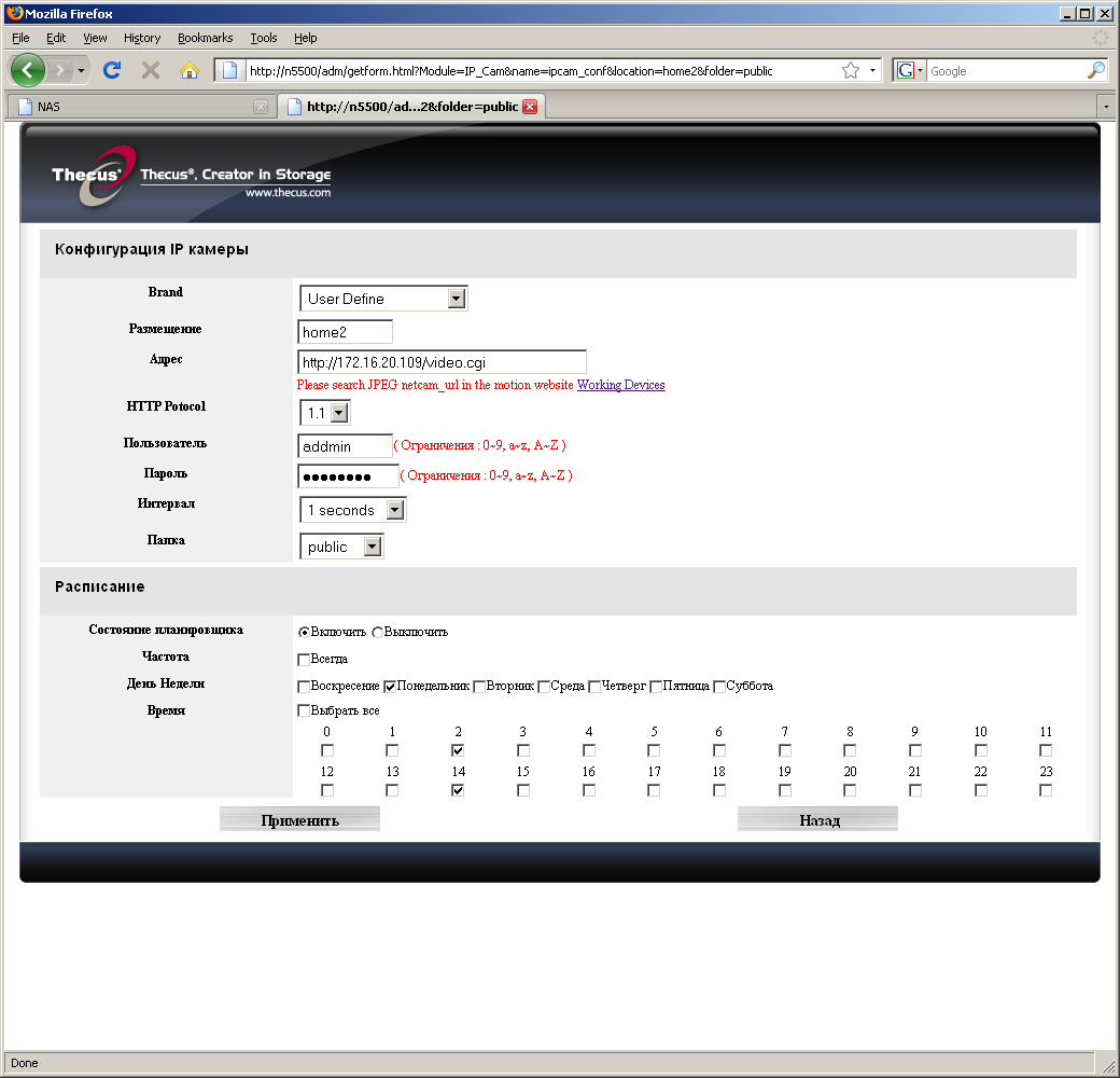 Последний предоставленный Thecus модуль реализует функционал цифрового видеомагнитофона для сетевых камер. Кроме записи картинок с наложением даты и времени через заданный интервал в указанную директорию, никаких других возможностей нет. Со списком поддерживаемых камер можно ознакомиться на сайте производителя. Единственное, что может быть здесь интересно, — работа с двумя десятками камер одновременно.