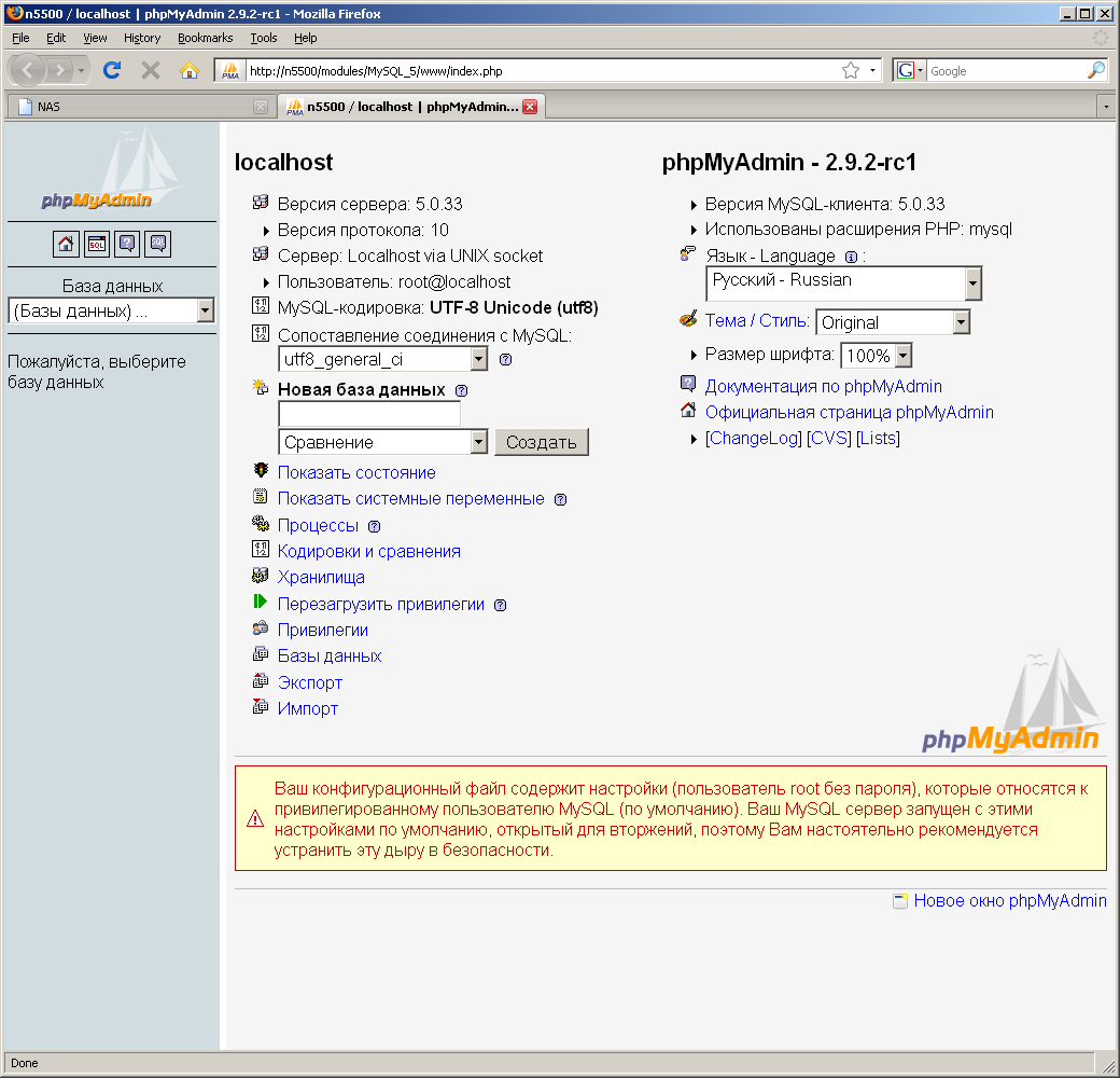 Вторая доступная программа — сервер MySQL. В данном случае идет речь о версии 5.0.33, для работы с которой устанавливается также phpMyAdmin (версии 2.9.2-rc1). Этот модуль может быть использован для реализации функционала базы данных в том числе и для работы совместно с web-сервером, который реализован в третьем пакете.