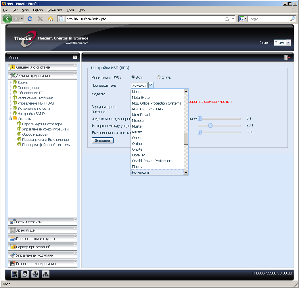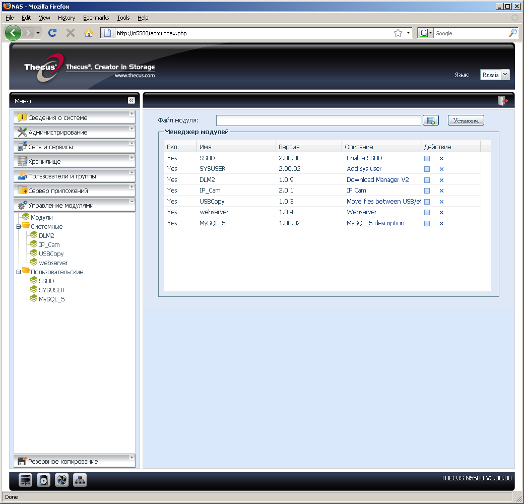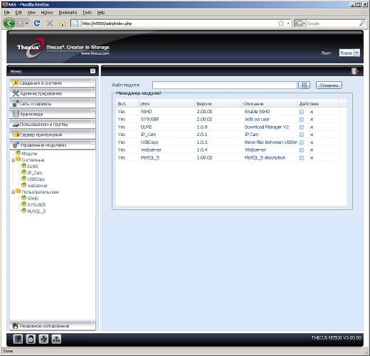 Рассматриваемая модель относительно свежая, однако она совместима с прошлыми продуктами Thecus (в частности N5200), так что разработанные энтузиастами для них модули можно запустить и на ней. К примеру, это позволяет получить полный доступ к консоли через ssh. После этого можно установить и использовать для наращивания функционала систему управления пакетами Optware. Производительный процессор и большой объем оперативной памяти позволяют запускать достаточно ресурсоемкие приложения.