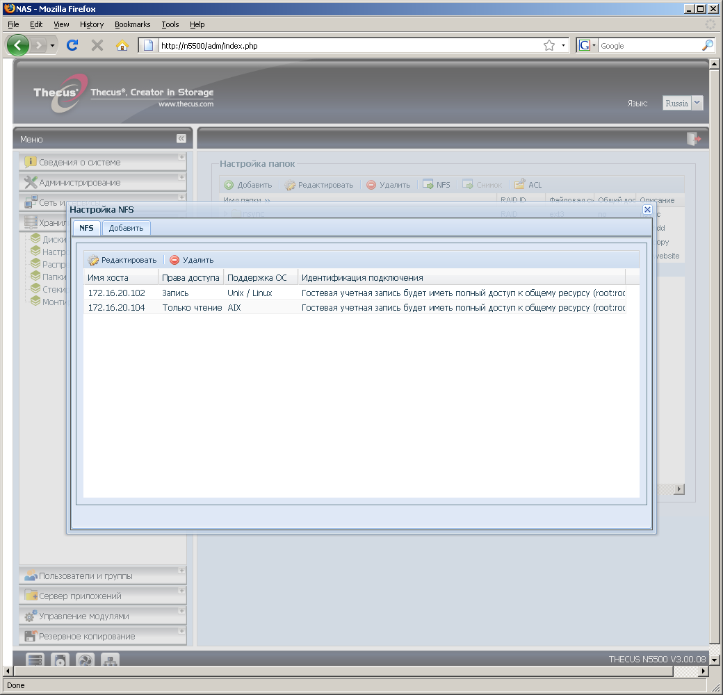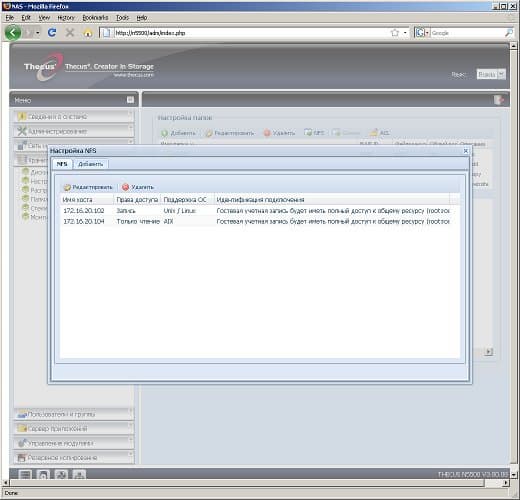 Управление общими ресурсами уже более привычно — указываем имя директории, права пользователей и групп, для NFS – список клиентов с указанием прав доступа.