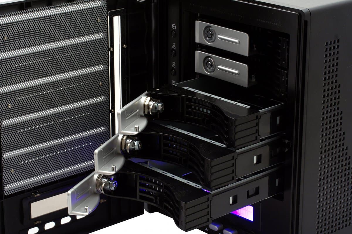 Передняя панель имеет крышку, которая открывается более чем на 180 градусов, имеет решетку для вентиляции, специальную прозрачную вставку для индикаторов и отверстия в нижней части для доступа к экрану и кнопкам. Основное пространство за крышкой занимают отсеки для установки жестких дисков. Они поддерживают горячую замену и могут закрываться на ключ.