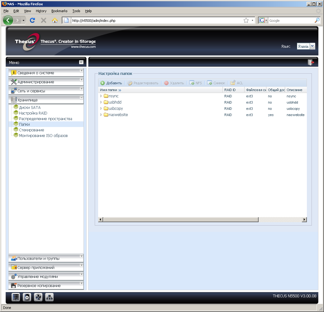 Резюмируя данный параграф, можно сказать, что основной функционал Thecus N5500 выглядит вполне современно. Особенно отметим богатые возможности по работе с RAID-массивами.