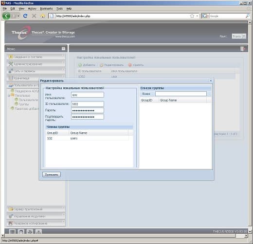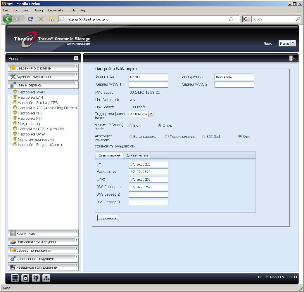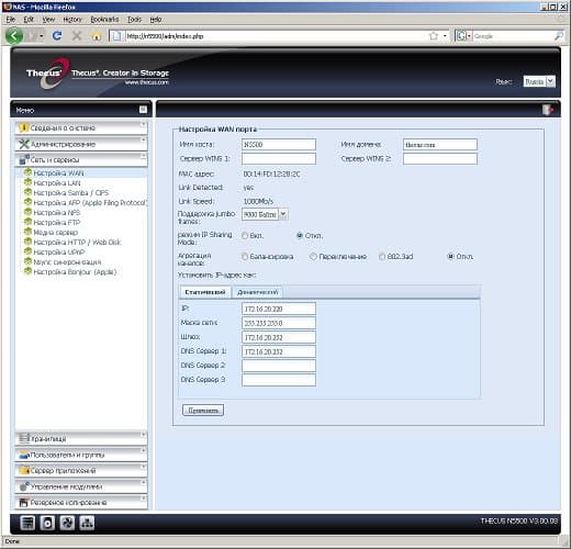 На данном этапе надо учесть две особенности конфигурации сети у Thecus. Во-первых, сетевые порты не являются одинаковыми, так что при первом подключении в локальную сеть желательно использовать именно первый. Во-вторых, по умолчанию адреса прописаны жестко, что может потребовать перенастройки компьютера, с которого будет осуществляться настройка накопителя.
