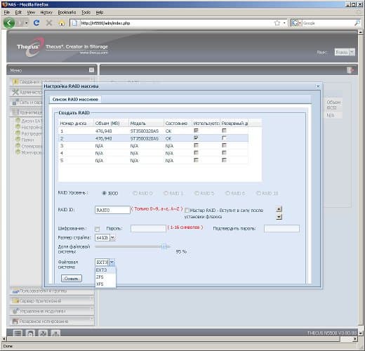 Данные пользователя размещаются на RAID-массивах, которые создаются из пяти встроенных дисков. Внешние к ним добавить нельзя. Зато есть возможность построения любой физически возможной конфигурации из нескольких томов, использующих разные режимы — JBOD, RAID0, RAID1, RAID5, RAID6, RAID10. Интересной особенностью модели является поддержка нескольких файловых систем — ext3, zfs и xfs и управление размером блока массива (штатное значение — 64 КБ). Упомянутые файловые системы имеют свои особенности, которые нужно учитывать при проектировании решения. В частности, ext3 (в реализации N5500) имеет максимальный объем тома 8 ТБ, так что для конфигураций из новейших 2-ТБ винчестеров ее может и «не хватить». Zfs единственная поддерживает технологию снимков файловой системы, может быть только на одном томе в системе, доступна только по протоколу SMB/CIFS, но не NFS или AFP. А xfs не работает с квотами для папок. Также предусмотрено шифрование томов.