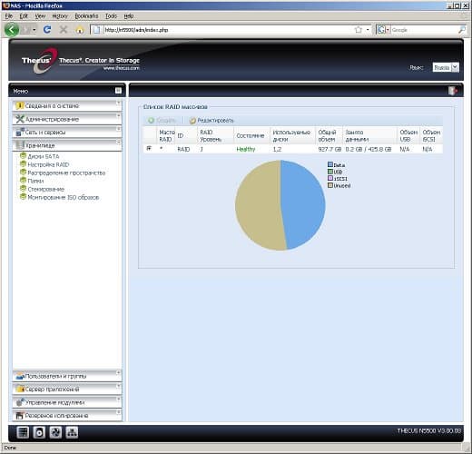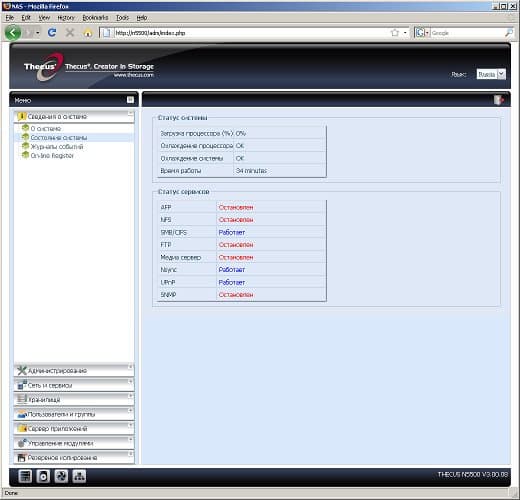 Интерфейс стал больше похож на уже привычный для этого класса устройств — дерево пунктов в столбце слева и основное поле со страницами настроек в центре. Дополнительно присутствует иконка выхода и кнопки для быстрого доступа к основным статусным страницам (правда четвертая не работает, а третья имея подпись «FAN» на самом деле приводит к списку состояния сервисов). Также в нижней строке можно узнать версию прошивки накопителя.