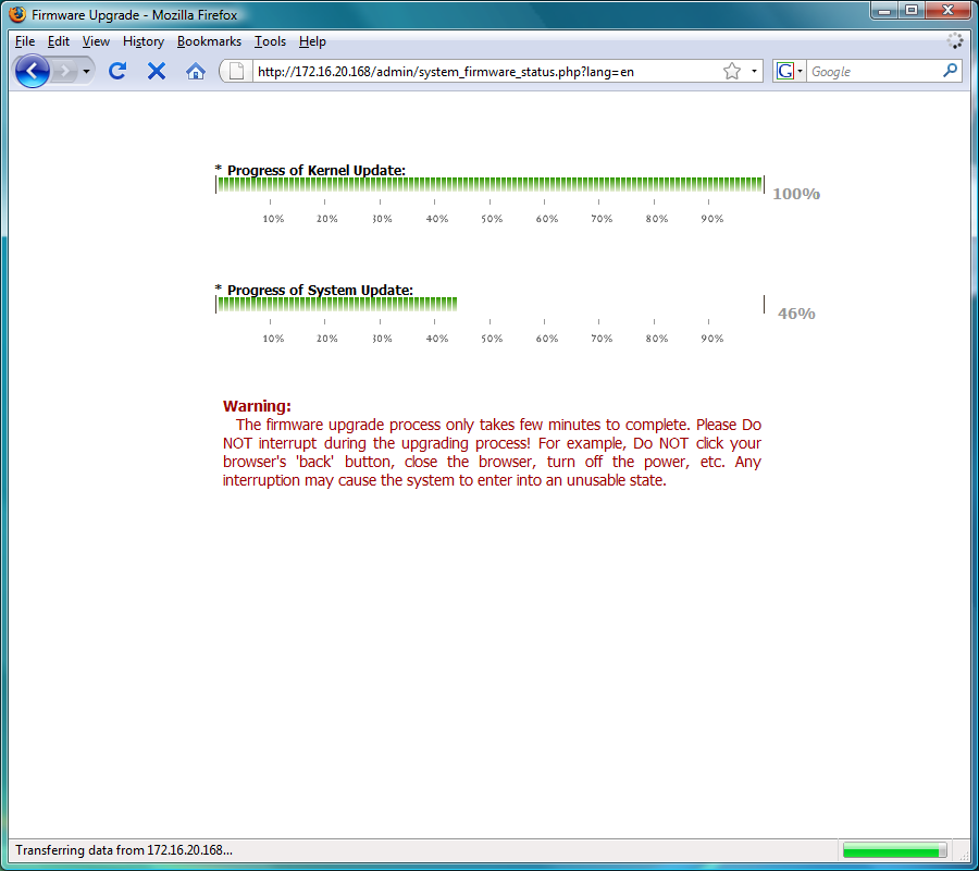 Во время инициализации через Web-интерфейс можно наблюдать страничку с индикатором продвижения этого процесса и оценкой оставшегося времени.