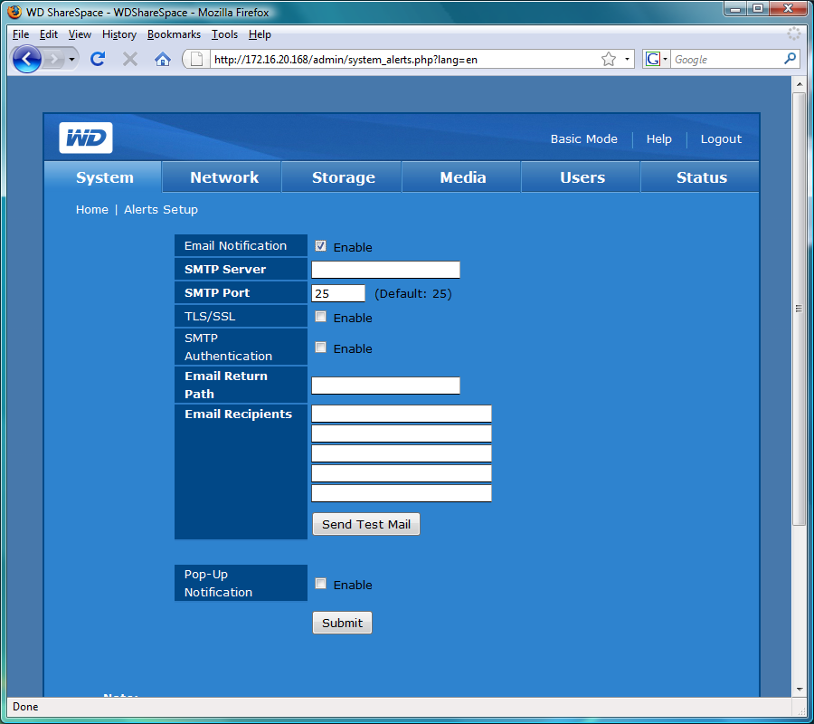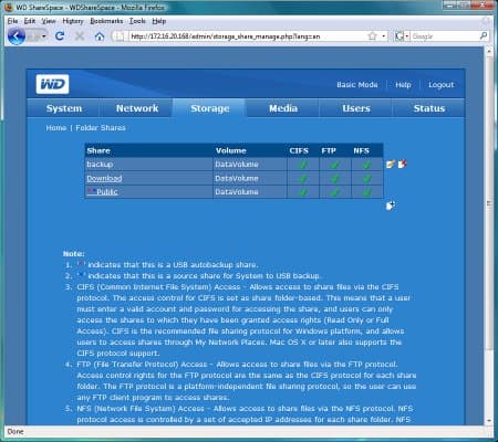 Интерфейс представлен в двух видах — Basic Mode и Advanced Mode. Как ясно из названия, в первом случае мы получаем только несколько основных настроек, а второй дает возможность полного управления накопителем. Начнем с первого варианта. На странице мы видим восемь иконок: Device Name позволяет изменить сетевое имя и описание устройства, Date & Time установить встроенные часы (в ручном режиме или с использованием сервера NTP), за Network скрываются сетевые адреса и MTU (установка режима Jumbo Frames не очень удобна — вместо галочек или данных из списка пользователю предлагается самостоятельно определить и ввести числовое значение), Users используется для добавления или удаления пользователей системы, Folder Shares нужна для настройки общих папок (только создание и удаление, изменение названий или описаний не предусмотрено, права задаются на другой странице), Remote Access в нашем случае не работал, поскольку не было установлено программного модуля MioNet, и последняя иконка — выключение или перезагрузка сервера.