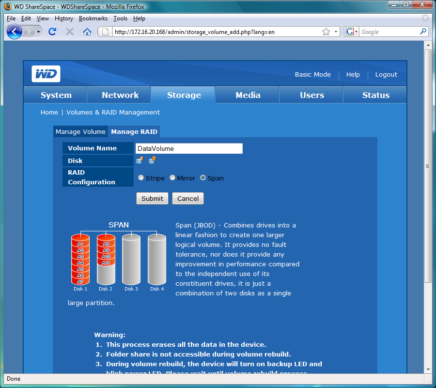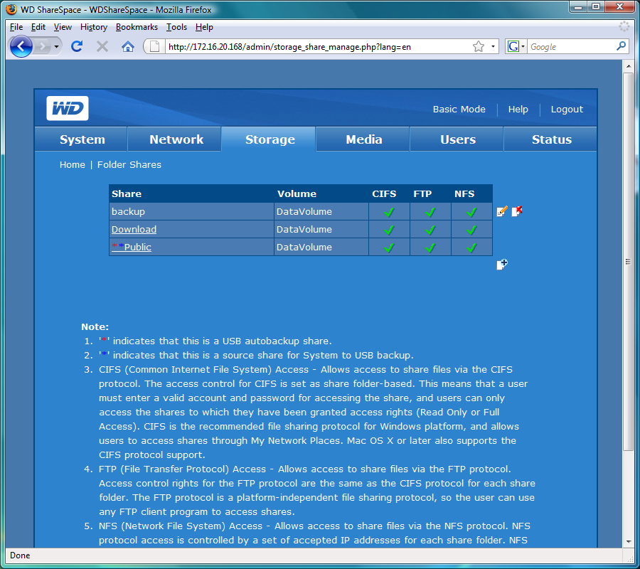 Конфигурация томов и подробная настройка общих папок указывается на странице Storage. В частности, здесь можно посмотреть на красивую картинку установленных дисков с указанием их места в накопителе. Несмотря на то, что дисков может быть четыре, организовать из них можно только один массив. Никаких средств по миграции или замене винчестеров на более емкие не предусмотрено. Хотя сегодня данная возможность встречается во многих других моделях, в WD решили ее не реализовывать.