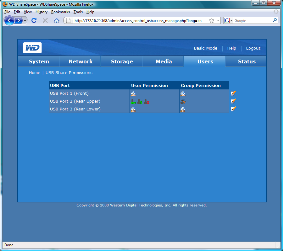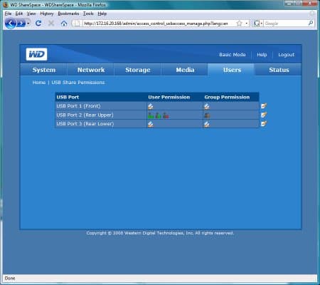 В расширенном режиме можно не только программировать имена пользователей и их пароли, но и организовывать группы, устанавливать права на директории. Предусмотрено два варианта работы общих папок — или публичный доступ (полный для всех пользователей) или же точное указание для пользователей и групп одного из вариантов — «полный доступ», «только чтение» или «нет доступа». Для NFS можно только выбрать режим — «только чтение» или «чтение и запись» для всех клиентов (напомним, что их адреса указываются на странице Network). Аналогично устанавливаются права доступа для USB-накопителей, причем последние выбираются непосредственно по физическому расположению порта. Если устройств к одному порту подключено несколько (через хаб), то права для них одинаковые.
