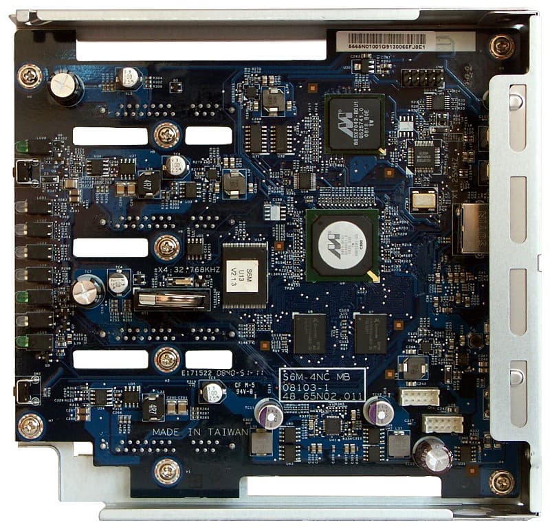 Как мы уже говорили выше, вся «начинка» собрана на единственной плате. На ней расположена вычислительная часть, разъемы для дисков, индикаторы и кнопки. Основную работу выполняет процессор Marvell 88F5281 (ядро ARM, 500 МГц), оперативная память – два чипа Qimonda общим объемом 128 МБ, сеть интегрирована в процессор, флешпамять — 16 МБ, контроллер SATA Marvell 88SX7042, USB-хаб GL805A. В общем ничего неожиданного. На самой плате есть несколько неподписанных разъемов, скорее всего они могут использоваться для организации дополнительных портов USB и консольного доступа.