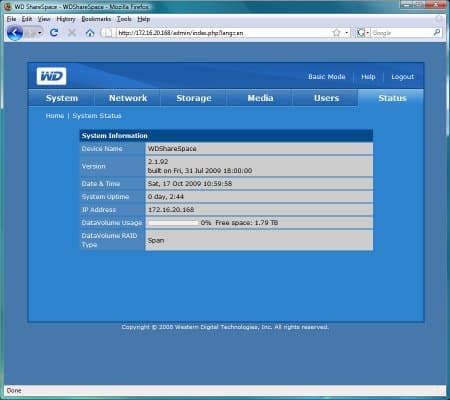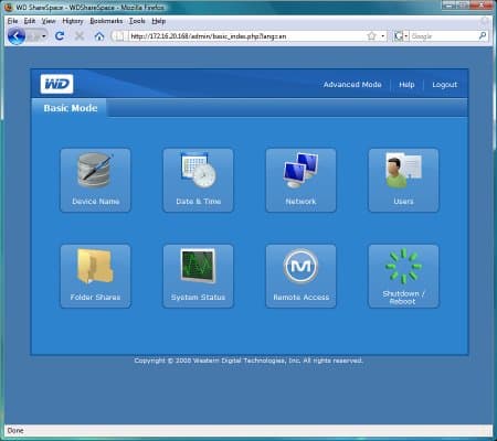Устройство полностью готово к работе — подключаем питание и сеть, ждем несколько минут и можно обратиться к Web-интерфейсу для настройки пользователей и общих папок. При необходимости изменения числа/объема винчестеров необходимо снять крышку и поменять/добавить диски. Стоит обратить внимание, что установить в накопитель можно только диски от WD, что несколько ограничивает пользователей. С другой стороны, WD – сегодня один из лидеров рынка, так что всегда можно подобрать нужную модель от этого производителя.