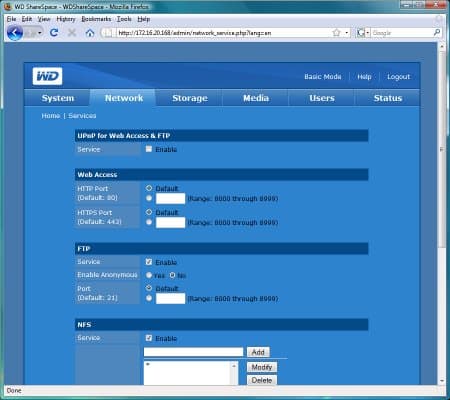 Следом идет Network, на ней, кроме описанной выше установки адресов, есть также пункты настройки сервисов: UPnP для автоматической проброски портов для Web-интерфейса и FTP через роутер, изменение портов для HTTP/HTTPS, выбор основного порта для FTP и разрешение анонимного доступа, задание списка адресов клиентов для NFS, изменение имени рабочей группы или включение накопителя в домен. По сравнению с другими недавно рассмотренными моделями явно недостает настроек для FTP, например кодовой страницы, ограничения скоростей, выбора портов для пассивного режима. Кстати, русские имена файлов видны по FTP, если клиент понимает Unicode и настроен на него.
