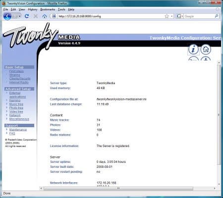 Медиасервер UPnP AV/DLNA представлен полной версией TwonkyMedia. Это одна из лучших программ для организации потоковых трансляции на современные сетевые медиаплееры. Она позволяет работать с большинством аудио/видео форматов, включая HD-видео. Индексируются файлы jpeg, bmp, gif, tif, png, mp3, m4a, aac, wma, ogg, wav, flac, mpeg, avi, mp4, wmv, divx, mkv, ts, m2ts, mts. Подобный список пожалуй удовлетворит большинство пользователей.