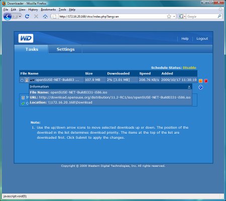 Для доступа на страницы менеджера загрузок необходимо на начальной странице Web-интерфейса указать имя пользователя downloader, его пароль (настраивается) и в списке Tool — данный сервис. Достаточно оригинальное решение для ограничения доступа и для домашнего использования вполне подходит (включая и удаленный доступ к сервису). Настройки сервиса включают в себя: ограничение числа задач (максимум — три), ограничение скорости, работа через прокси и установка расписания (таблица по дням недели и трехчасовым интервалам). Для загрузки используется известная программа wget. В параметрах задачи указывается ссылка, имя пользователя и пароль (при необходимости) и, возможно, имя файла, под которым он сохраняется на диск.