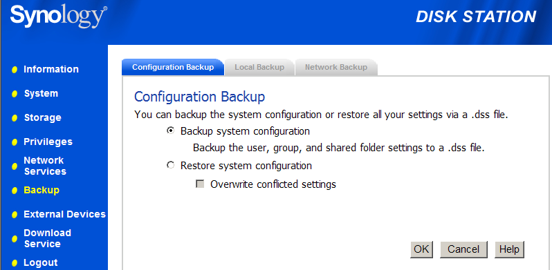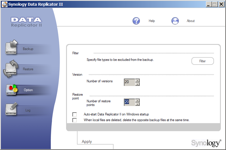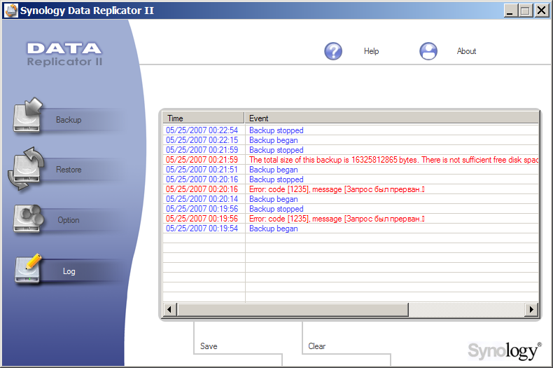 - утилита резервного копирования Synology Data Replicator II (см. скриншоты 01, 02, 03, 04, 05, 06, 07, 08, 09) — ничего особенного, файловое копирование с возможностью откатов, синхронизации и запуска по расписанию — но без возможности компрессии;