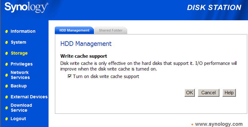 Кроме того, в опциях управляющего ПО DS-101g+ в разделе Storage / HDD Management имеется пункт Turn on disk write cache support, так что мы решили также проверить эффективность использованных алгоритмов кэширования записи.