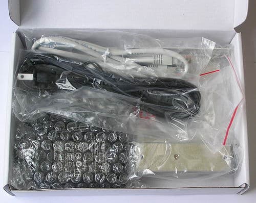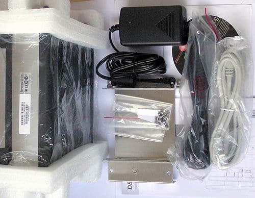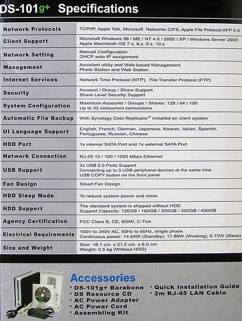 Внутри коробки кроме самого DS-101g+ находятся CD с ПО, сетевой адаптер питания (на выходе +12 В с током до 3 А), комплект для установки жёсткого диска (жестяной каркас и фурнитура), двухметровый патч-корд и Quick Installation Guide (5 языков, из европейских — английский).