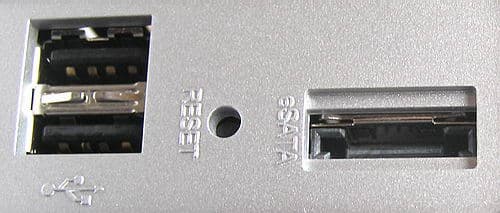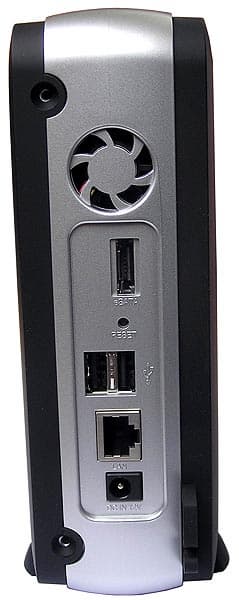 кнопка питания и разъем USB с кнопкой COPY над ним (предназначена для копирования на внутренний винчестер содержимого USB-дика с FAT32). На заднем выходное отверстие маленького (2,5 см) и потому шумноватого вентилятора, разъем eSATA, кнопку RESET, еще 2 разъема USB, RJ45 и разъем питания, а также ушко для кабеля безопасности.