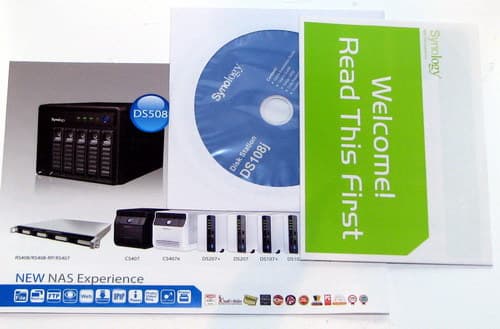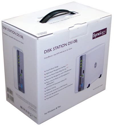 Упаковка и комплект поставки Synology DS108j типичны для для продуктов компании — добротный картон коробки с ручкой для переноски,